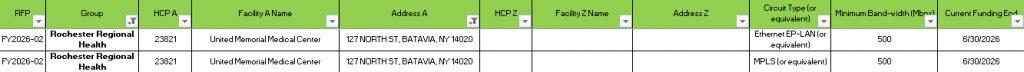 4. It appears that Rochester Regional has requested the same service twice at the same address. If you look at the bidder spreadsheet, lines 53 and 54 both list Rochester Regional requesting Internet access with the same bandwidth of 2000. I’m wondering if line 54 should actually reflect a different bandwidth—perhaps 5000 or 10,000?